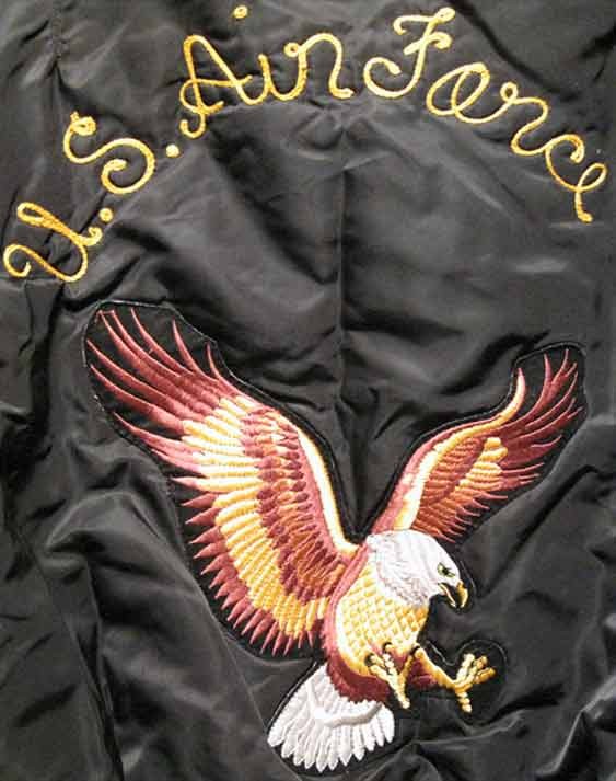 Great condition jacket with multiple patches including an American Flag arm patch, 323 BMTS chest patch, California and Texas State patches and POW-MIA patch. Stitched “Haas” on chest. Back has huge heavily stitched Eagle patch (11 1/2″ at highest) with “U.S. Air Force” stitched above it. Ideal Zipper/pull. Size is a modern extra large. Normally we would measure underarm to underarm but the cut of this jacket does not lend itself to this measurement. Knit waist and cuffs and reversible Orange interior. Nice and warm.