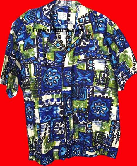 Amdigo Fiji Made Blue & Green Tapa Pattern near Barkcloth Hawaiian Shirt