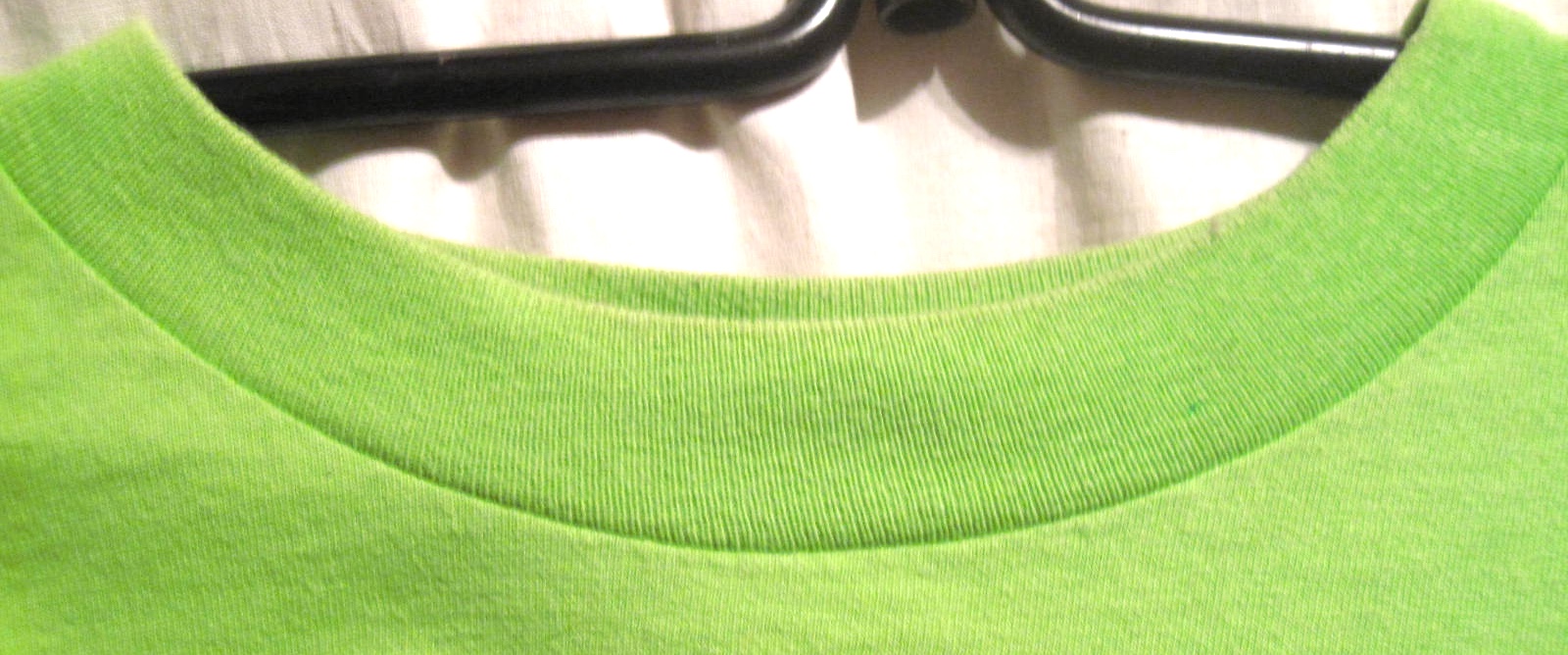 There are a few reddish tone light marks. We believe these are storage marks as they are also seen on one side of the shirt from a fold. These are overstated in our pictures so the buyer can be aware. They appear pretty light and may clean off.