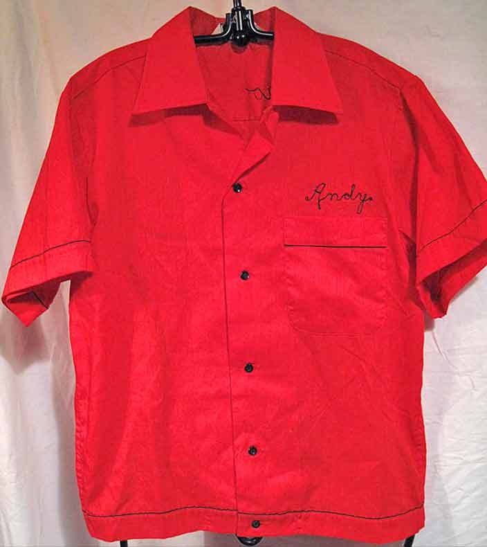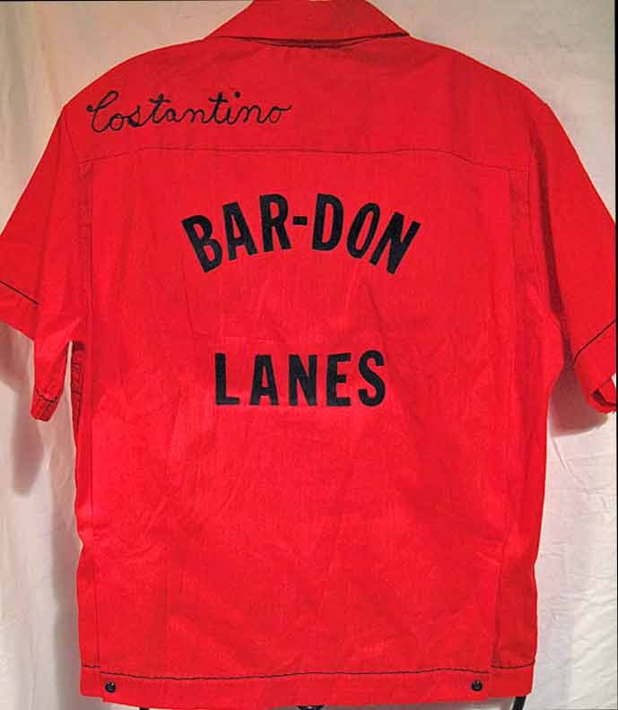 Chest measures 38″. Stitched “Andy” over pocket and “Costantino” on back Yoke. Applied flocked “Bar-Don Lanes” on back. Sure looks like the Shirt was never worn but there are a couple of very small stray marks at the 4th button that are visible mostly in bright lighting and close-up.