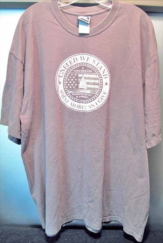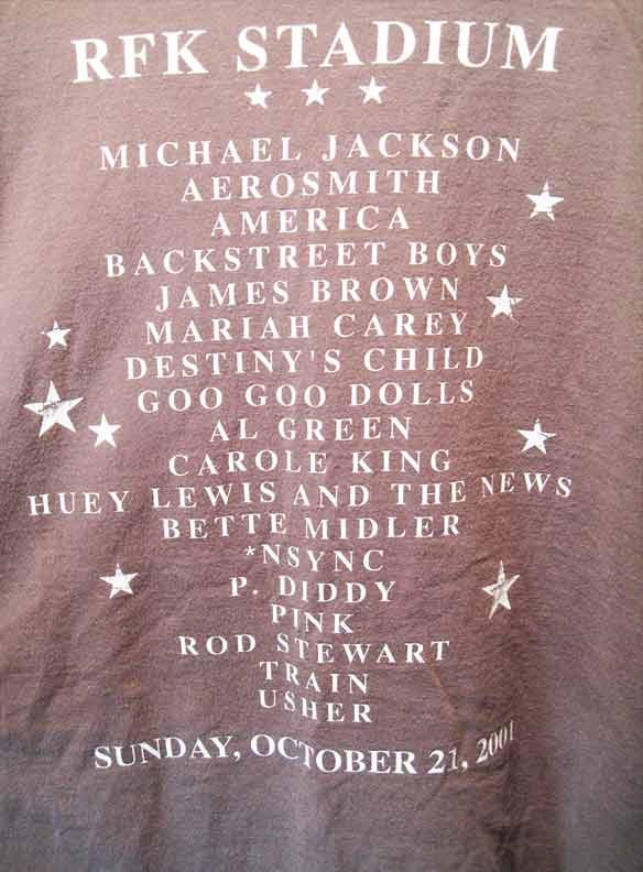 Very scarce shirt, sold only at the 10/21/2001 Concert at RFK Stadium after 911. Headliner was Michael Jackson but the listed Groups and performers is stellar and includes Aerosmith, America, Backstreet Boys, James Brown, Huey Lewis and the News, Bette Midler, P. Diddy, Pink, Rod Stewart and Usher among others all listed on the back along with the Venue and date.
