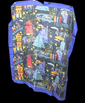50’s. 2 1/2″ square. Probably silk interior with heavier blue edging. Both center top and bottom edging is split at center seam but not onto image portion. Top right edging is open at edge and has a couple of small tears. Exc..
