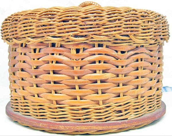 8″ diameter and 5 inches high. Very well kept vintage basket that may have been made as a sewing basket. Multiple materials used and hand made. It is simply beautiful and solid with very few signs of it’s age.