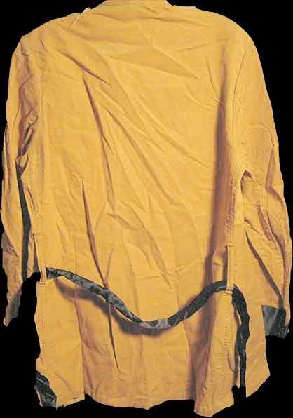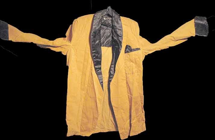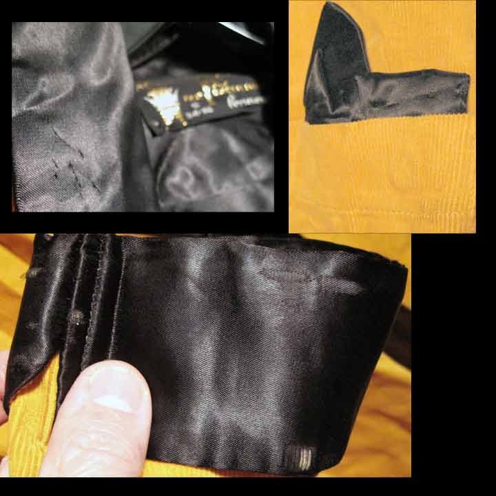 Marked small 34-36″. We find that with the lapels lightly overlapping that the largest chest/bust size is 40″. There are few small pin holes near the right shoulder on the lapel. Right sleeve cuff has some snares and small holes (see pictures). Inner buttons for handkerchief show on the outside from storage but should smooth when hung and worn. Scarce color, normally found and offered in Red and rarely with the cool pocket hankie.